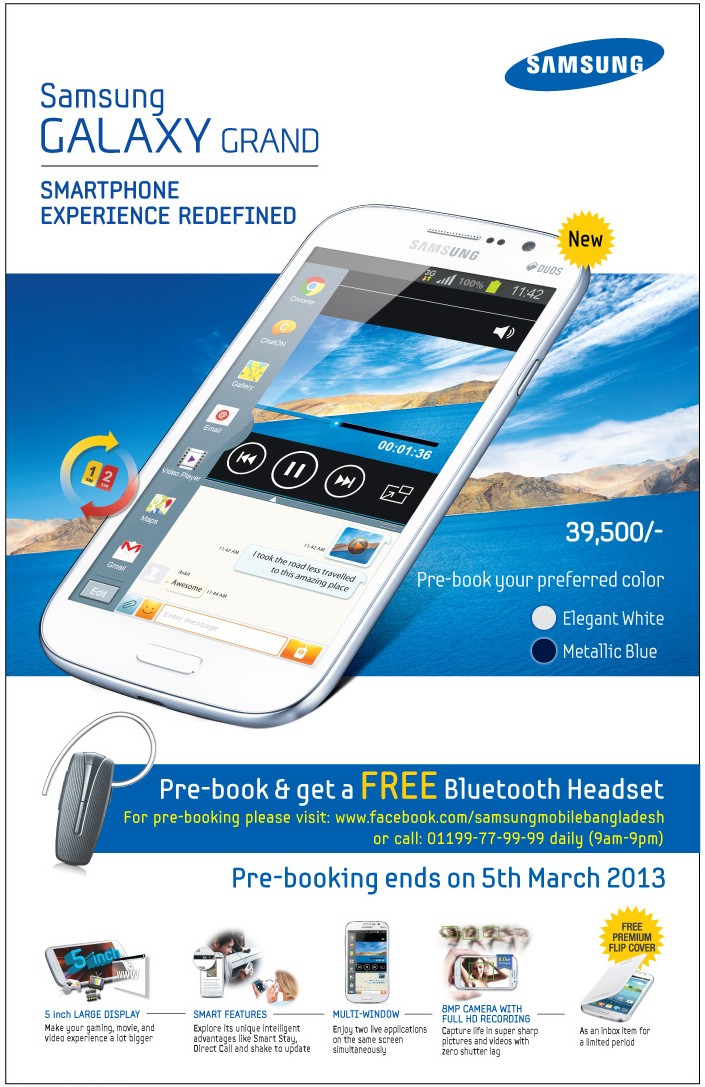 Samsung Galaxy Grand offers free Bluetooth Headset in Bangladesh. The Samsung Galaxy Grand, 5 inch large display offers a rich gaming and movie viewing experience, bigger and better than before. The Multi-window feature on Samsung Galaxy grand’s screen lets you work on multiple apps on the screen simultaneously. The Samsung Galaxy Grand priced at BDT 39,500. The pre booking has started already from February 23 and shall continue till March 5, 2013.